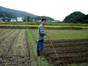 所が、だ。ホウレン草の種1つとっても、数え切れない程の種類がある。どれが良いのか真剣に悩んでいると「見て見て!このホウレン草、『オーライ』って言うんだってキャハハ・・なんか付けた人の意気込みが感じられちゃうよねー。っていうか、もしかしたら結果オーライってことかなー」sijimiは名前を見て楽しんでいる。・・・ったく!しかし結局、その意気込みに掛けてみようぜ、という事で結果オーライ(?)に決める。他にはネギ、ひの菜、三つ葉の種を購入。畑に戻り、さっそクワを使って畝(うね)を作る。元々は田んぼだったので土の状態が粘土質だ。固まりがゴロゴロしていて水はけが悪そう。ようやく畝を作り、sijimiが種を蒔く。蒔く、蒔く・・のは良いがせっかく作った畝の溝に蒔いている(-_-;) |